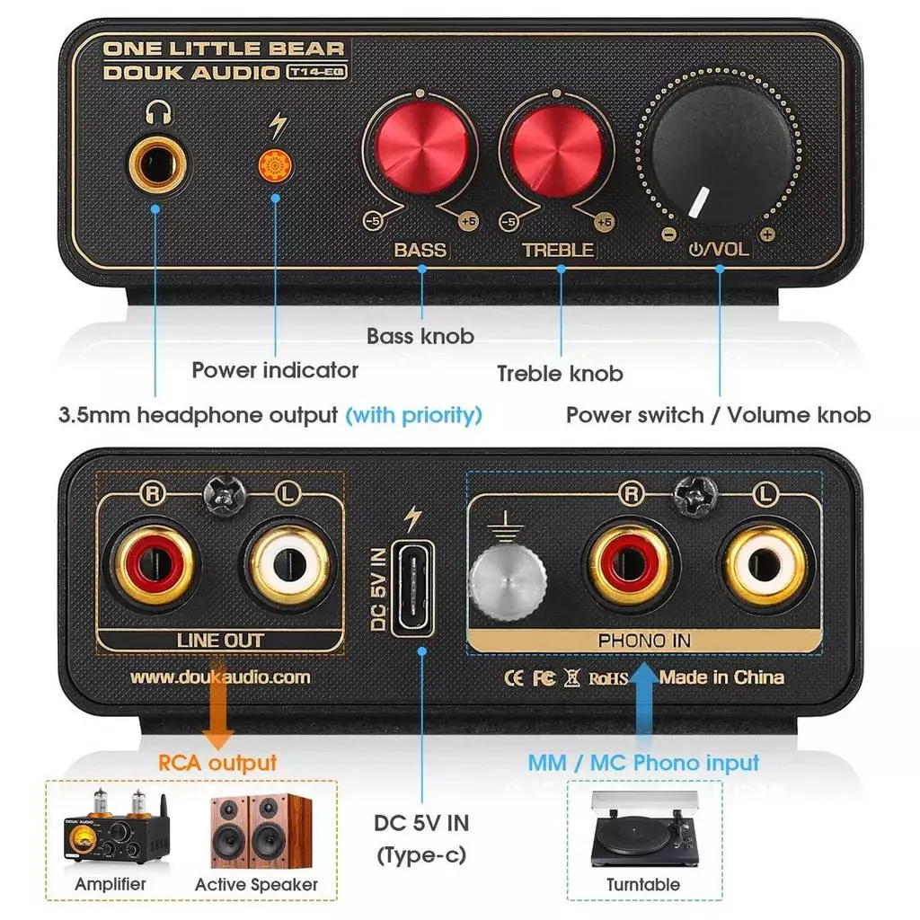 Douk Audio T14-EQ หรือที่รู้จักกันในชื่อ One Little Bear คือปรีโฟโนสำหรับหัวเข็ม MM (Moving Magnet) ที่ออกแบบมาให้ใช้งานง่าย ให้โทนเสียงอบอุ่น นุ่มนวล และสามารถปรับบุคลิกเสียงได้ตามต้องการด้วยปุ่ม Bass / Treble EQ บนตัวเครื่อง